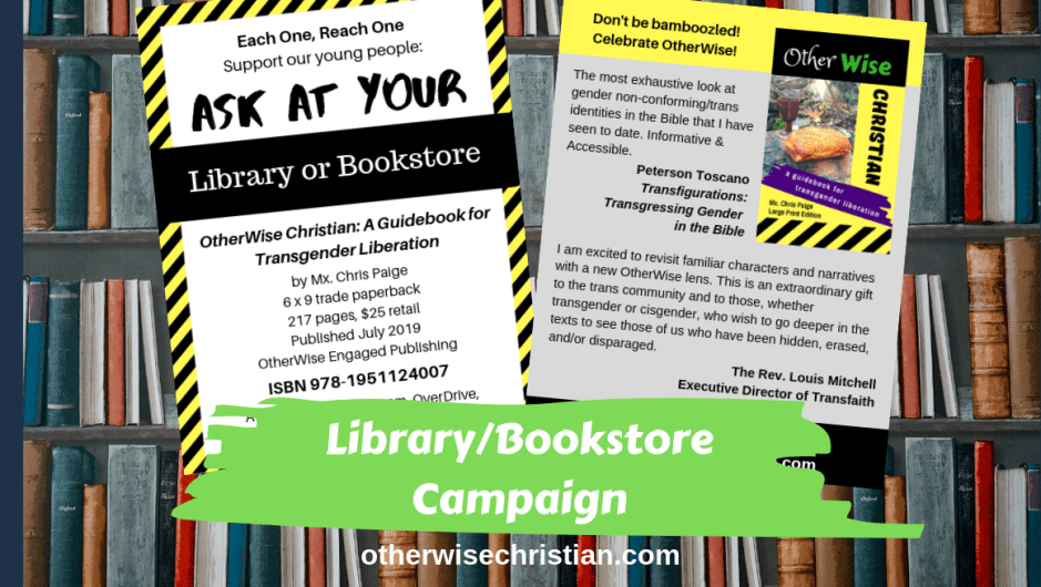 So my dream for OtherWise Christian: A Guidebook for Transgender Liberation to be a resource to those who are most affected by and vulnerable to transphobia and trans-antagonism. That means making this book available in as many libraries and bookstores as possible so that anonymous seekers can find it.